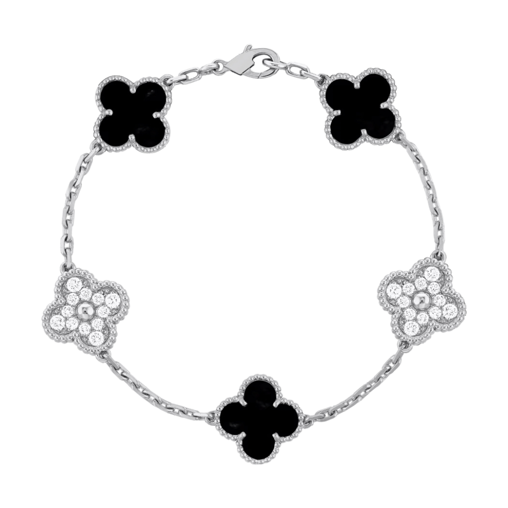 5 Clover 18K VS1 Diamond Solid White Gold & Black Bracelet